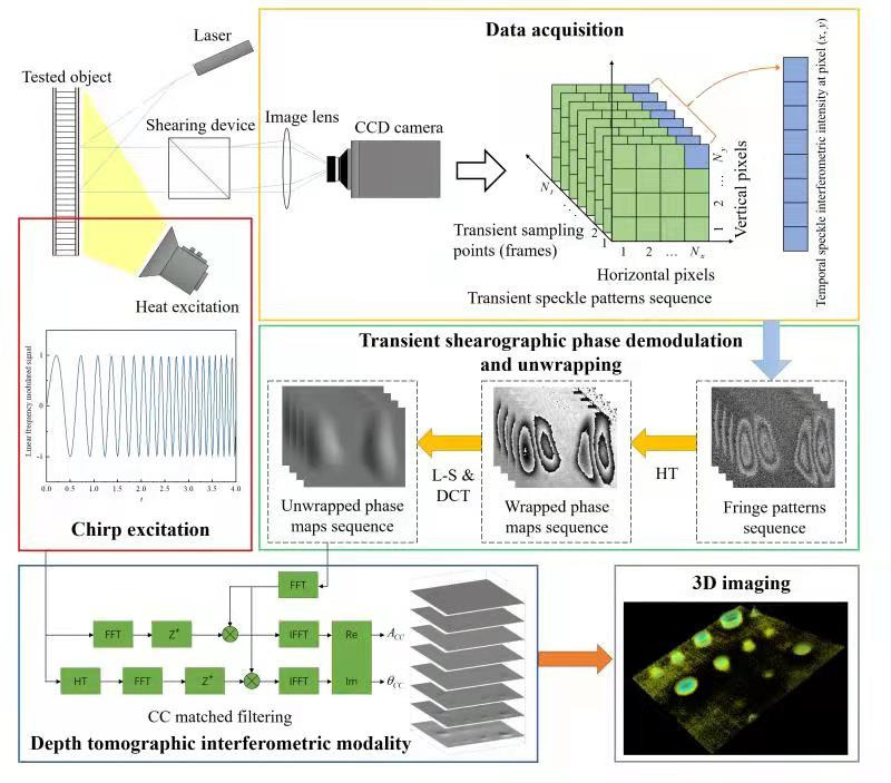 作为目前最有效的光学干涉无损检测技术,剪切散斑成像技术在各种工业应用中受到广泛欢迎。然而,该技术存在忽略动态表面形变全过程信息和无法表征结构深度分辨信息的缺点。针对剪切散斑成像技术的局限性,研究团队提出了一种新型散斑干涉成像模态:光热雷达瞬态剪切散斑干涉断层扫描成像。不同于传统剪切散斑成像的差分模式,该工作利用调频光热激励将结构深度分辨信息编码到结构动态表面形变过程。利用希尔伯特变换和离散余弦变换对记录的瞬态散斑图像序列每个像素的时域干涉信号进行解调以得到瞬态全场剪切相位分布。同时,使用增量延迟互相关匹配滤波定位结构轴向能量分布以生成结构深度层析反演成像结果。光热雷达瞬态剪切散斑干涉断层扫描成像首次实现了基于光学散斑干涉测量技术的结构损伤三维可视化,对装备结构损伤多通道信息反演研究发展提供了重要技术支撑。