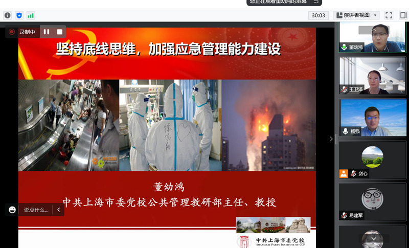 为进一步深入学习贯彻习近平总书记关于安全生产重要论述,强化理论武装,6月21日晚上,5357cc拉斯维加斯邀请中共上海市委党校(上海行政学院)公共管理教研部主任、上海市委党校应急管理培训中心主任董幼鸿教授作题为“坚持底线思维,加强应急管理能力建设”的辅导报告,学院全体教师通过腾讯会议参加学习。报告会由学院党委宣传委员王卫泽主持。